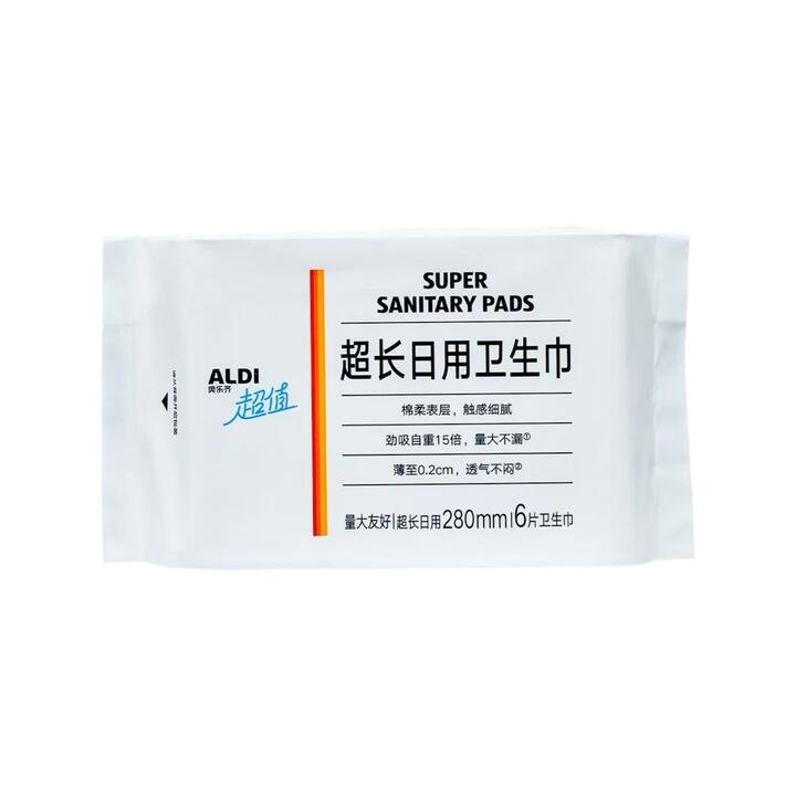 ALDI Super Sanitary Pads are designed for dependable daytime protection with an extra-long 280 mm length. Ultra-thin yet highly absorbent, they combine a cotton-soft topsheet with breathable comfort—ideal for heavier flow days. Limited Import, brought in from ALDI China private label. Product Highlights: Extra-Long 280 mm: Extended coverage for confident day use. Cotton-Soft Topsheet: Gentle, skin-friendly feel. High Absorbency: Locks in up to 15x its weight to help prevent leaks. Ultra-Thin 2 mm: Discreet, comfortable fit that moves with you. Breathable Design: Helps reduce stuffiness and keeps you fresh. Pack of 6 Pads: Convenient for on-the-go or trial use.
