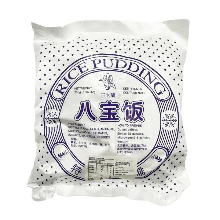 Enjoy the delightful taste of Baiyulan Fragrant Glutinous Eight Treasures Rice, a traditional Chinese dessert made with a blend of glutinous rice and a variety of sweet ingredients. This 200g pack is perfect for a quick and satisfying treat. Product Highlights: Traditional Flavor: A classic Chinese dessert with a rich history. Quality Ingredients: Made with glutinous rice, red bean paste, and more. Convenient Preparation: Easy to prepare by steaming or microwaving. Perfect Portion: 200g pack, ideal for a single serving. Frozen Freshness: Maintains taste and texture when stored in the freezer.