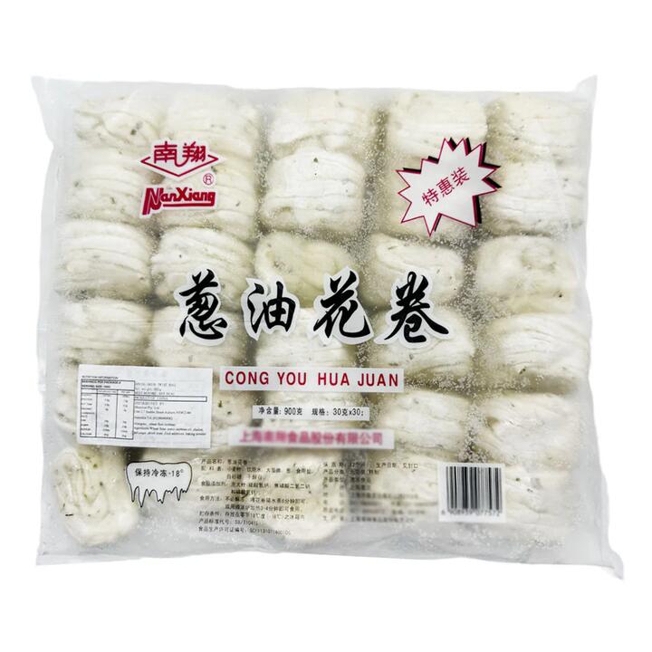 These are frozen Nanxiang Scallion Oil Flower Rolls, a traditional Chinese delicacy, packed in a set of 30 pieces weighing 900g. They are easy to prepare and serve, offering a delicious taste of scallion oil in every bite.