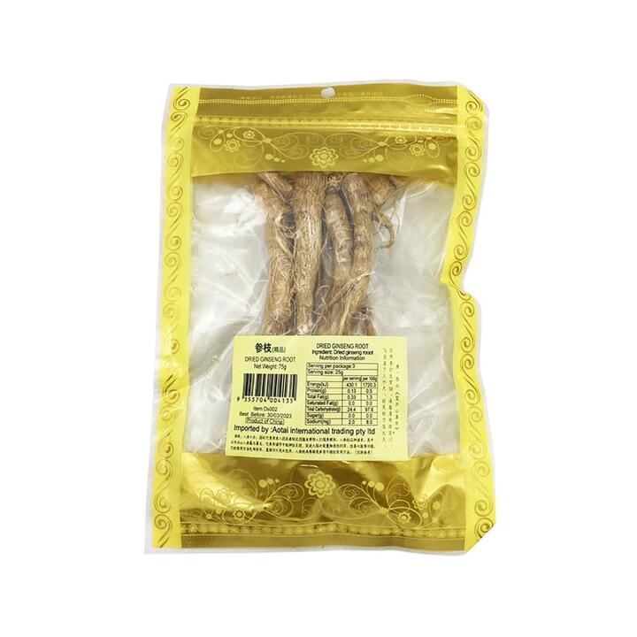 Experience the health benefits of Golden Bag Dried Ginseng Root, packed in a convenient 75g package. Known for its medicinal properties, ginseng root is a popular herbal remedy used to boost energy, improve mental function, and support overall well-being. Each root is carefully selected and dried to preserve its natural qualities and potency. Perfect for making tea, adding to soups, or using in various traditional recipes, this dried ginseng root is a versatile addition to your pantry. Enjoy the premium quality and health benefits of Golden Bag Dried Ginseng Root.