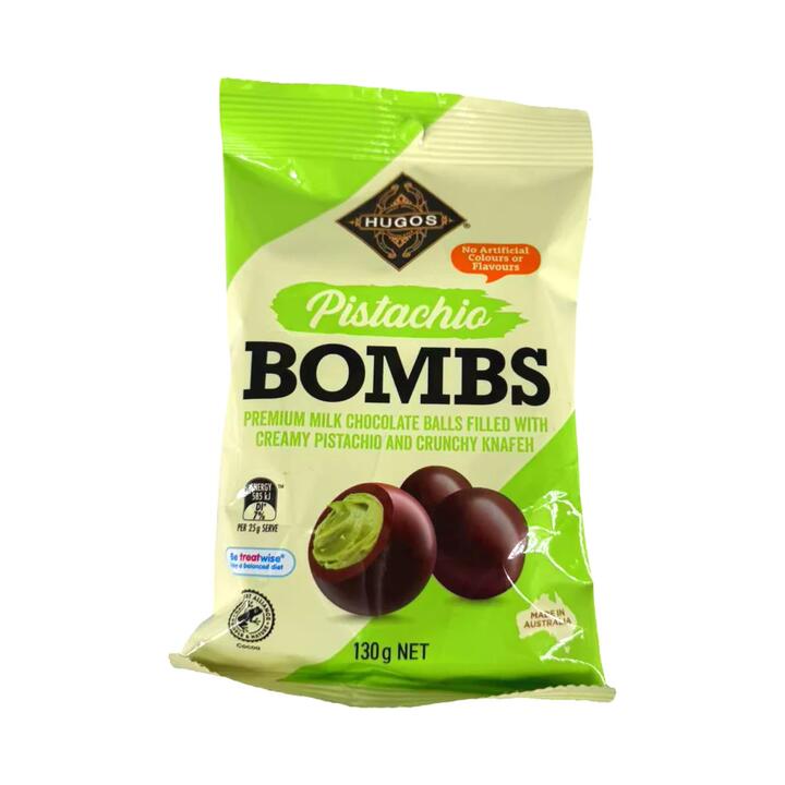 Indulge in the delightful taste of Hugos Pistachio Bombs. These premium milk chocolate balls are filled with smooth, creamy pistachio and crunchy knafeh for a unique treat. Perfect for snacking or sharing with friends. Product Highlights: Premium Milk Chocolate: Smooth chocolate shell with rich flavor. Creamy Pistachio Filling: Bursting with authentic pistachio taste. Crunchy Knafeh Center: Adds delightful texture contrast. Convenient Pack: 130g size, perfect for on-the-go enjoyment. No Artificial Colours or Flavours: Made with natural ingredients.