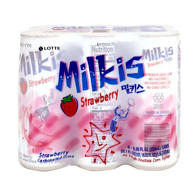 A pack of 6, 250ml cans of Lotte Milkis Strawberry Flavoured Milk Soda, offering a unique blend of milk and soda with a sweet strawberry taste.