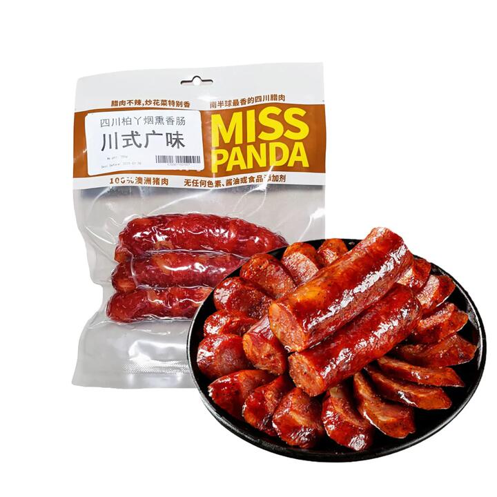 Enjoy the authentic taste of Sichuan with Miss Panda’s Smoked Sausage. This mildly spicy sausage is perfect for those who love a hint of spice without overwhelming heat. Made with premium ingredients, it’s a delicious addition to any meal. Product Highlights: Authentic Sichuan Flavor: Traditional smoked sausage with a mild spicy kick. High-Quality Ingredients: Made with premium pork for the best taste. Versatile Use: Perfect for stir-fries, soups, or as a standalone snack. Convenient Packaging: 250g pack, easy to store and use. Refrigeration Required: Keep refrigerated to maintain freshness.