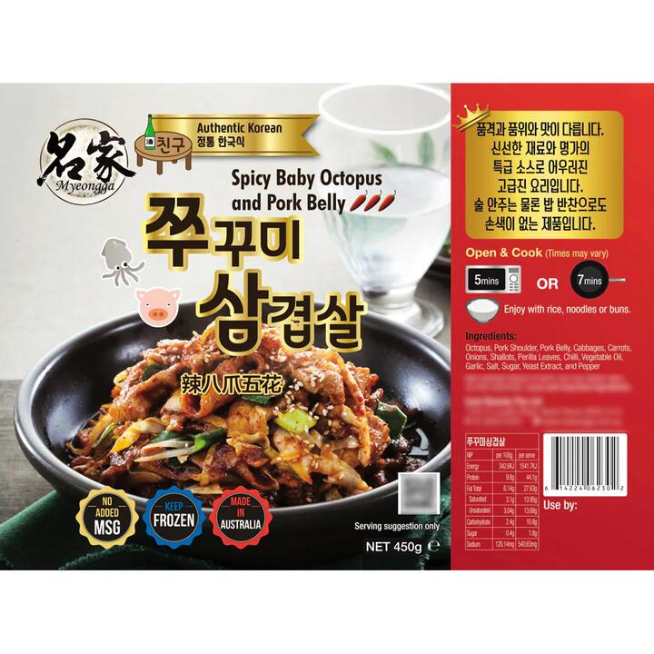 Enjoy the authentic taste of Korean cuisine with Myeongga Spicy Baby Octopus and Pork Belly. This 450g pack offers a delicious blend of tender octopus and savory pork belly, perfect for a quick and satisfying meal. Product Highlights: Authentic Korean Flavor: Spicy and savory, a true taste of Korea. High-Quality Ingredients: Made with premium octopus and pork belly. Easy to Prepare: Ready in minutes, just heat and serve. Versatile Dish: Enjoy with rice, noodles, or buns. Generous Portion: 450g pack, ideal for sharing or a hearty meal.