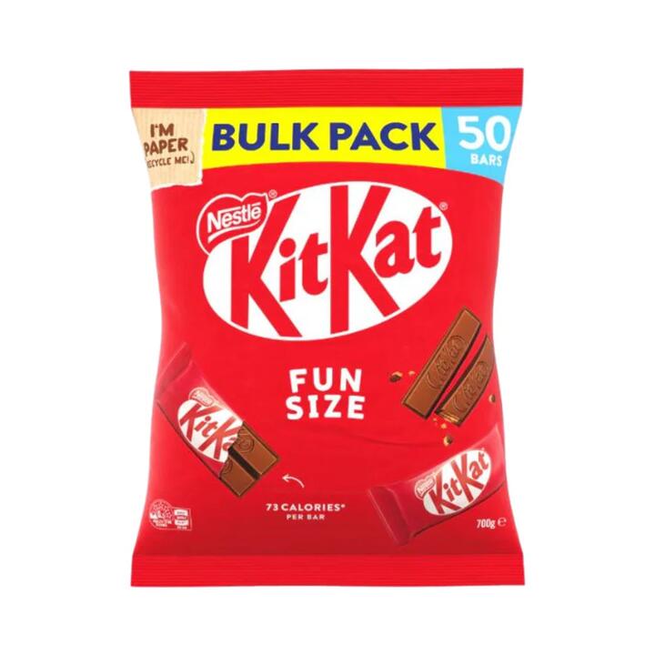 Enjoy the classic crunch and smooth milk chocolate of Nestlé KitKat in a convenient fun size. This bulk pack includes 50 individually wrapped 14g bars, perfect for sharing, snacking, or party favors. Sourced from Costco, it offers great value for chocolate lovers. Product Highlights: Bulk Pack: 50 fun size bars in one 700g bag. Convenient Portions: Each 14g bar is individually wrapped for freshness. Classic Flavor: Crispy wafer coated in smooth milk chocolate. Perfect for Sharing: Ideal for parties, office snacks, and lunch boxes. Value Pack: Bulk supply from Costco for great savings.
